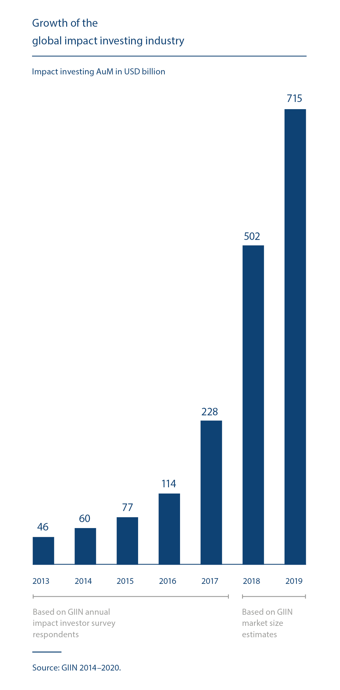 It is therefore no surprise that the size of the impact investing industry has quadrupled in the past years (see chart 4). Both retail and institutional investors, such as pension funds, insurance companies, banks, family offices, foundations, and religious institutions, are significantly increasing their allocations to impact investments. This growth is also a result of the increased availability of attractive impact investment opportunities across all asset classes. Today, the industry has reached a size that enables the absorption of large investments, supporting the investment appetite and commitment of institutional investors in the private sector.