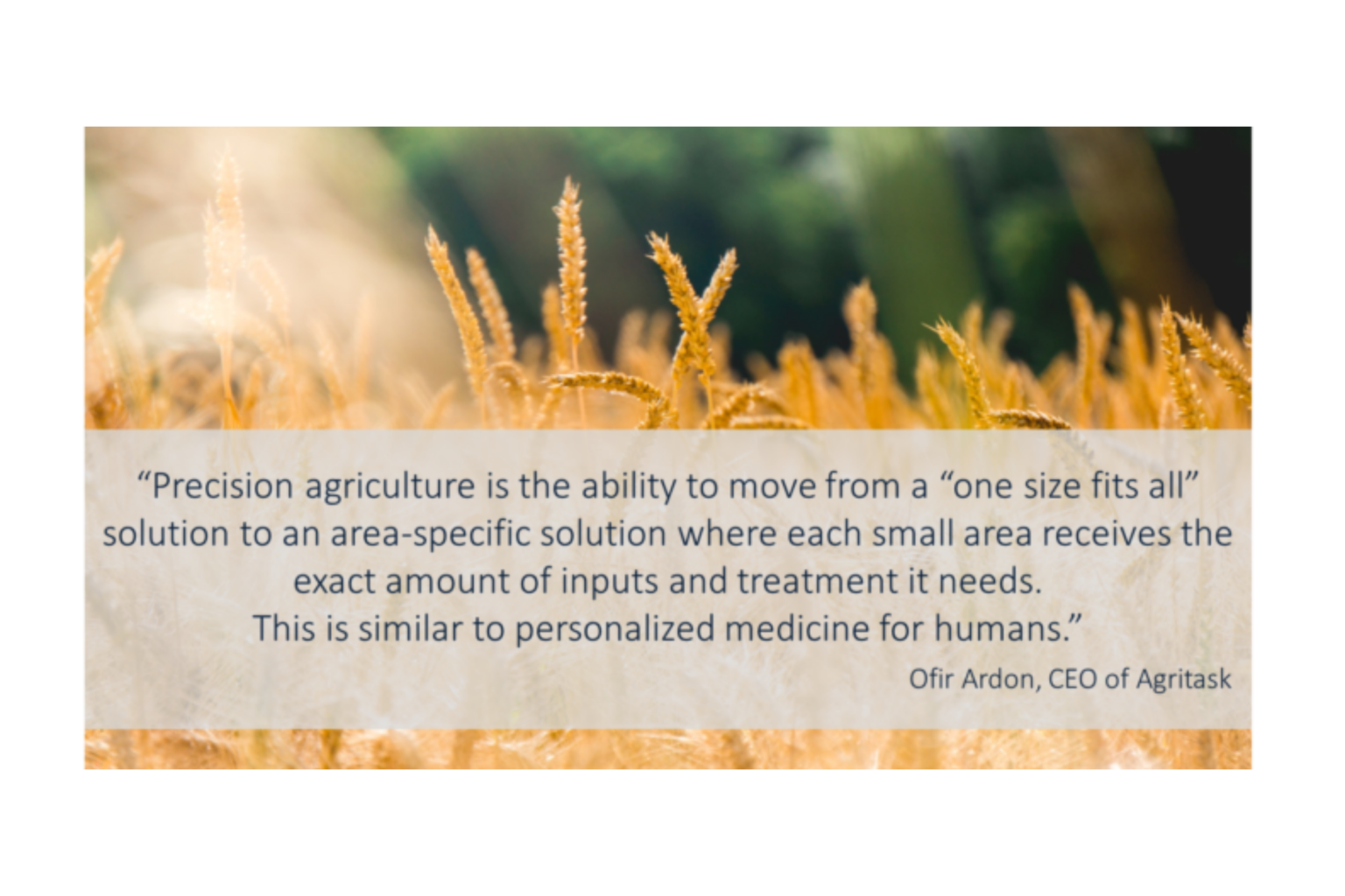 Ofir: Precision agriculture is the ability to move from a “one size fits all” solution where all fields receive the same treatment (such as irrigation, fertilization, spraying, among others) to an area-specific solution where each small area receives the exact amount of inputs and treatment it needs based on its specific conditions. This is similar to personalized medicine for humans.