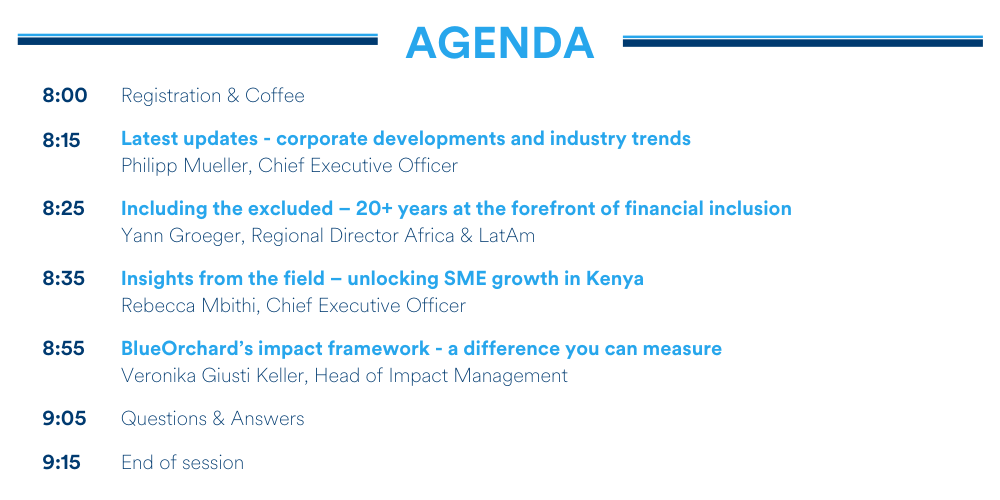 Please join us for this breakfast meeting to gain first-hand local insights from industry leaders on entrepreneurship’s integral role in empowering millions of lives and accelerating economic growth. Moreover, our team will present an overview of BlueOrchard’s unparalleled financial inclusion activities, and our bespoke impact measurement and management practices in this field. Finally, you will learn about our latest corporate milestones and industry developments.