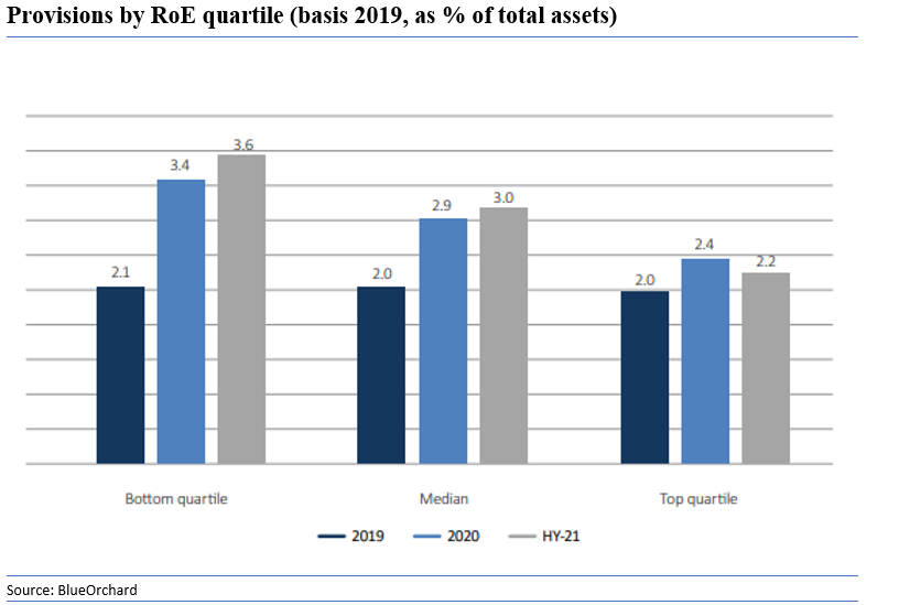 Data from BlueOrchard’s portfolio also show that the risks related to the pandemic have eased. Provisions as a percentage of total assets have stabilised for most companies, with those in the top-quartile even showing improvement. However, the pandemic has clearly impacted the balance sheets of most companies and this scenario lays the groundwork for equity fundraising in the near term.