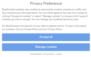 BlueOrchard’s website allows you to selectively accept cookies, based on your preference, by clicking on the “Manage cookies” button.