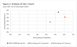 It’s important to understand the factors that contribute to the performance of EM Corporate debt. One key factor is the economic growth of the Emerging Markets themselves. According the IMF1, Emerging markets have grown on average by 4.1% from 2013-2022 which compares to 1.8% for Advanced Economies. As these economies continue to grow and develop, their companies are better positioned to meet their debt obligations. Additionally, the credit quality of EM Corporate debt has improved over the years. A study from J.P. Morgan shows that Global Emerging Market indebtedness has improved with net leverage decreasing from 2.1x in 2016 to 1.1x as of end-2022. Another key aspect has been the lower duration of EM Corporates relative to US Corporates. As a reminder, the lower the duration, the smaller the sensitivity to interest rates. A lower duration therefore contributed to less volatility and in turn better risk-adjusted returns. EM Corporates historically had a lower duration than the US Corporates. As of end-April-2023 it stands at 4.3 years which compares to 7.2 years for the US Corporate Index, according to Bloomberg. Further, we believe that the superior risk adjusted return comes from a universe with higher dispersion. The idiosyncratic nature of return in EM leads to more diversification at the universe level and lower volatility for the same level of risk premium.