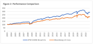 To begin, let’s take a look at the historical volatility of EM Corporate debt compared to the US Corporate index. While EM Corporate debt has experienced some periods of volatility, the overall trend shows that it has been less volatile than the US Corporate index over the past few years. In fact, the volatility of the J.P. Morgan Corporate EMBI Broad Diversified Composite Index (EM Corporates) over the past 10 and 20-years as of end April 2023 was at 4.9%, and 5.4%, respectively. While that of the Bloomberg Barclays US Corporate Index (US Corporates) was at 6.7% and 6.1% (see Figure 1). In terms of performance, EM Corporates outperformed US Corporates with an annualized return of 5.5% over a 20-year period as of end April 2023, surpassing the 4.1% annualized return of US Corporates. (Source: Bloomberg)