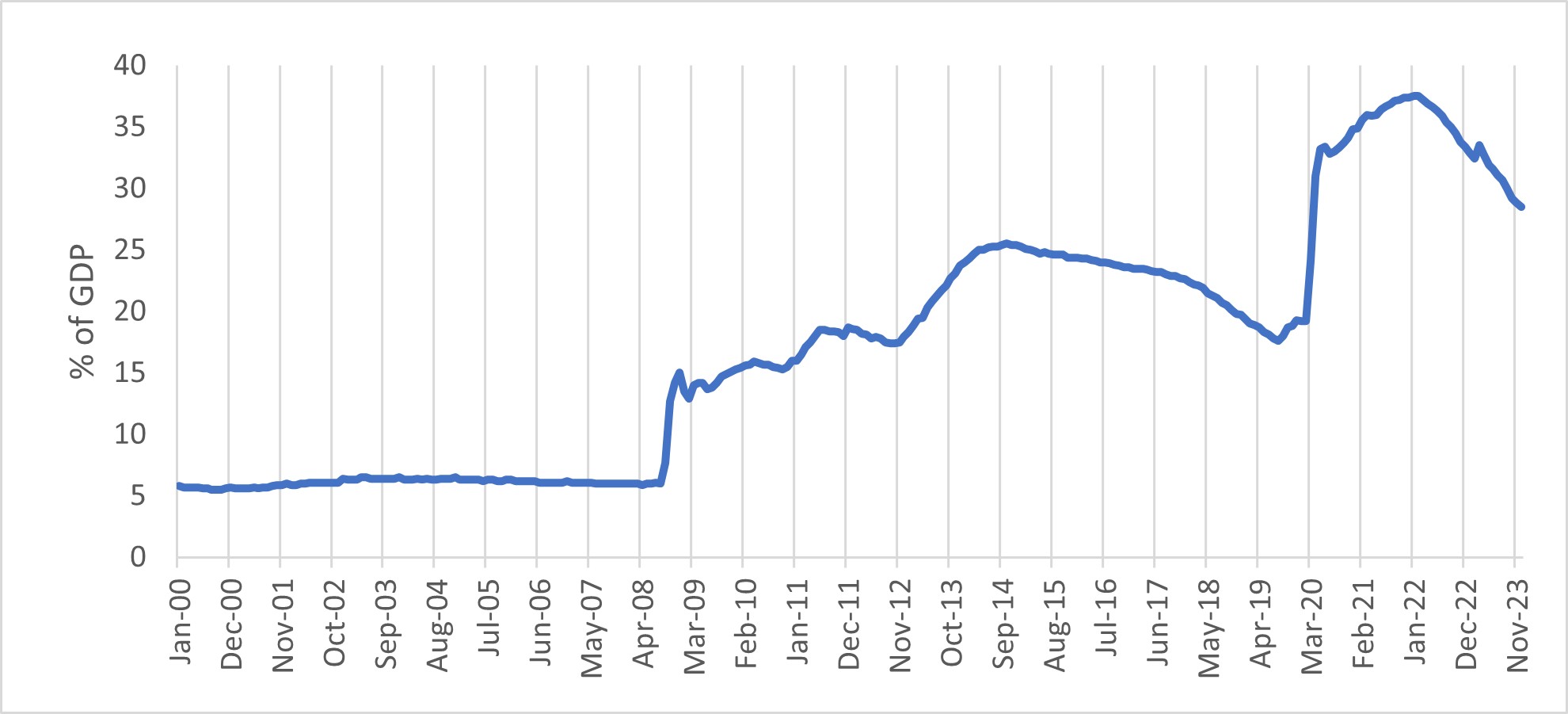 Figure 2: Federal reserve balance sheet from 2000 to 2023. Sources: Bloomberg; US Federal Reserve, 2023