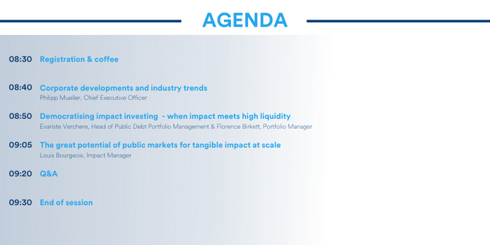 Join us at this event to gain first-hand insights from our investment and impact teams on how actively managed impact strategies can add significant portfolio diversification, their valuable role in protecting portfolios in a volatile market environment, and how our bespoke assessment tools allow us to evaluate the impact achieved. Further, our CEO will share with you the latest developments in the impact investing market and BlueOrchard’s recent key achievements.