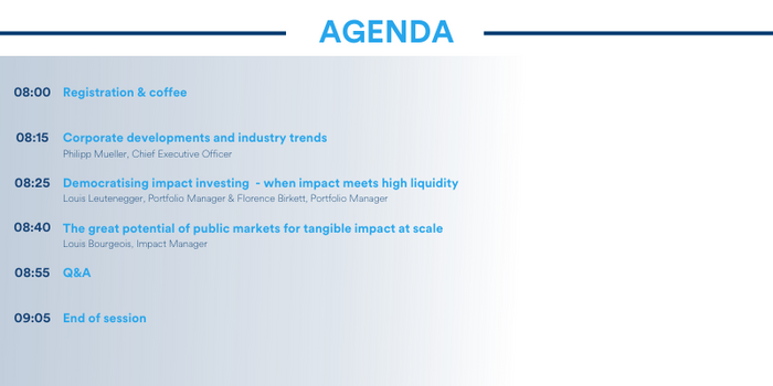 Join us at this event to gain first-hand insights from our investment and impact teams on how actively managed impact strategies can add significant portfolio diversification, their valuable role in protecting portfolios in a volatile market environment, and how our bespoke assessment tools allow us to evaluate the impact achieved. Further, our CEO will share with you the latest developments in the impact investing market and BlueOrchard’s recent key achievements.