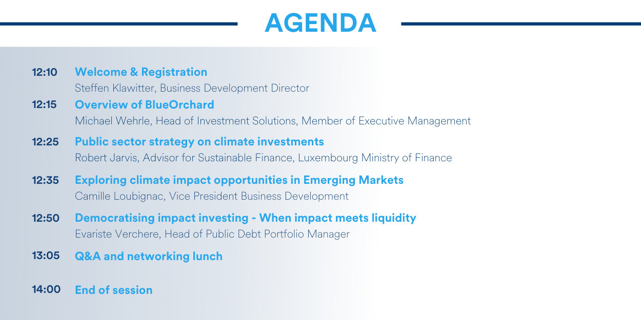 At BlueOrchard, we offer a range of strategies focused on delivering tangible, social, and environmental impact by promoting financial inclusion and supporting the transition to a low carbon economy. During this lunch meeting, we will present you our newest innovation in blended finance structures, exploring the untapped investment potential for investment in crucial areas for achieving net-zero targets and environmental protection. We will showcase concrete examples that demonstrate the risk adjusted returns and impact potential of these investments.
