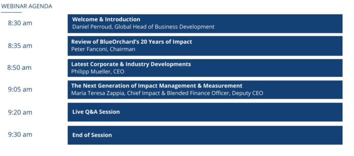 2021 marks BlueOrchard’s 20th anniversary. As part of this seminar, we will reflect on BlueOrchard’s pioneering role over the past two decades and how we have shaped the impact investing industry and aim to continue to do so. We have exciting new projects in the pipeline, which we would like to share with you first-hand during this event.