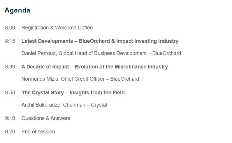 BlueOrchard is pleased to announce its next breakfast meeting at Brasserie Schiller, Sechseläutenplatz 10, Zurich, on Tuesday, 24 March 2020 at 8:00 am.