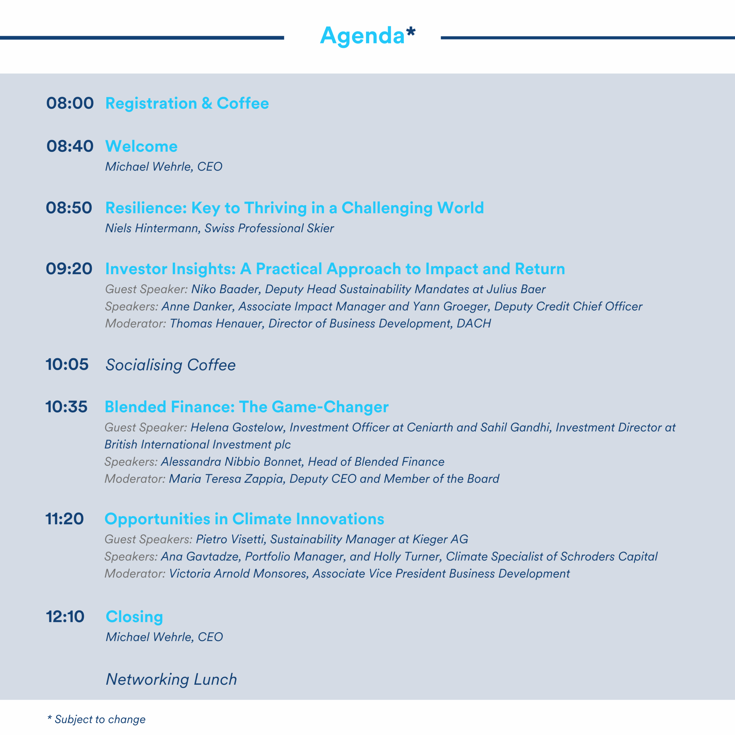Do not miss the second edition of our Impact Investor Day to be held on 19 June 2025 at 8.30am at the Resident, Kreuzstrasse 24, 8008 Zurich.