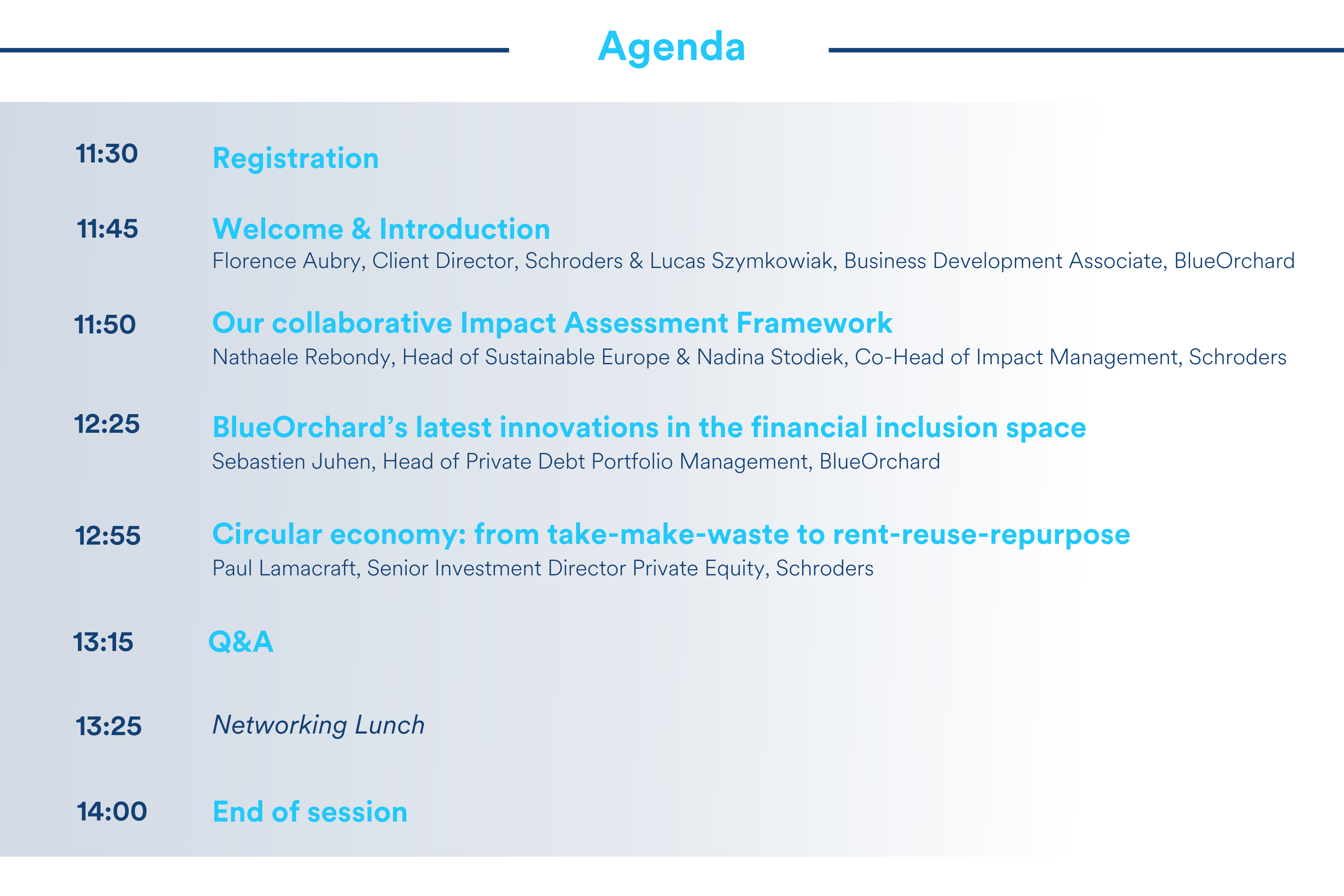 During the event, which will include a lunch, we will delve into our approach to impact investing and provide detailed insights into BlueOrchard’s and Schroders Capital’s key markets.