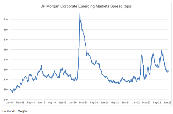 On the monetary policy front, emerging markets central banks, particularly in Latin America, are further ahead in their tightening cycle than their Developed Markets peers. This should thus leave those Central Banks ample room to take rates lower in the coming months in order to support their economies. In terms of valuations, emerging markets look attractive relative to historical standards. As of the end of December 2022, the JP Morgan Corporate emerging markets benchmark recorded a yield of 7.3% and a spread duration of 4.2 years. In other words, spreads would have to widen by 1.7% for the entire benchmark carry, i.e. its 7.3% annual yield, to be wiped out over a full year. Stripping out the period of the first Covid-19 outbreak in early 2020, emerging markets corporate spreads are currently trading towards the upper end of their average over the past five years. We would thus expect any potential move higher in spreads to remain well within 1.7% over the next year. Finally, flows into emerging markets were largely muted in 2022. We would expect them to recover in 2023 which would be a supportive technical for the asset class.
