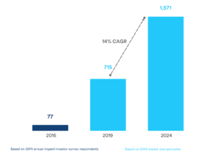 Growth of the global impact investing industry AuM in USD billion