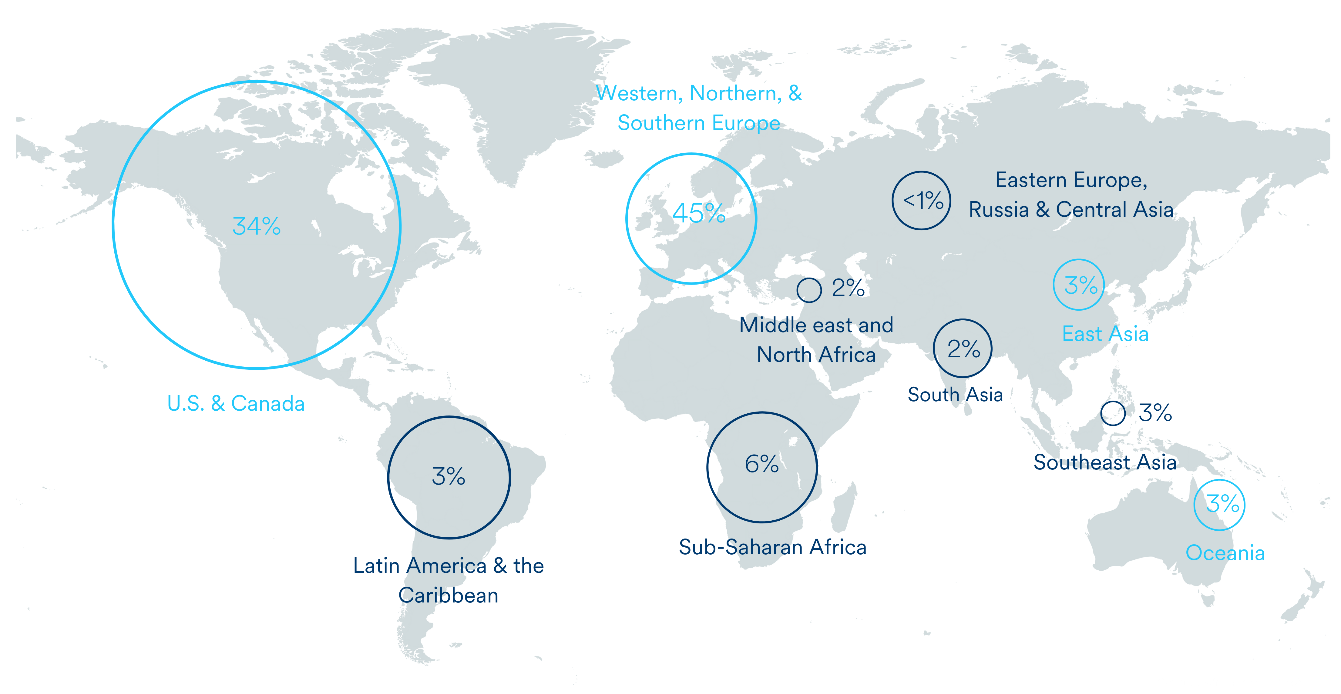 Impact investment opportunities are available globally. Investors can choose between investments in developed or developing markets, in specific regions or countries. According to the Global Impact Investing Network (GIIN), about 40% of Assets under Management (AuM) are allocated to emerging markets.