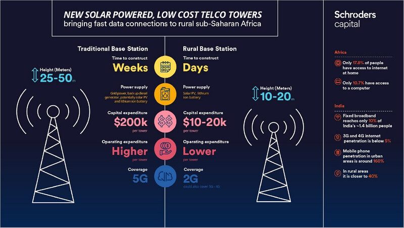 Imagine a bike race where the starter pistol sounds, and three quarters of the competitors have to bolt the wheels on before they can chase those already racing. Innovative technologies like these new telco towers are vital to creating a more level playing field for emerging economies. For the concept of the “just transition” – building greater resilience to climate change for communities it threatens most – tools promoting financial independence, social mobility and economic security are key, and investors can enable their development.